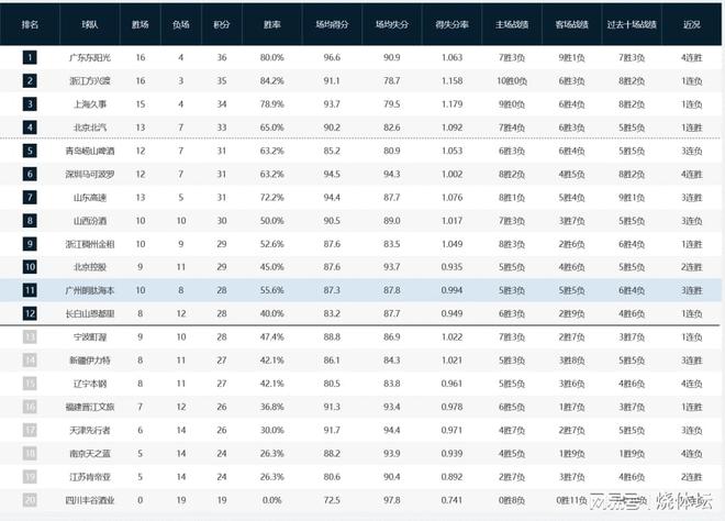 至此,本赛季常规赛赛程已经来到20轮,目前有6支球队完成20场比赛。本轮广东男篮主场告捷,暂时攀升到榜首位置,浙江广厦、上海久事分列第二、第三。