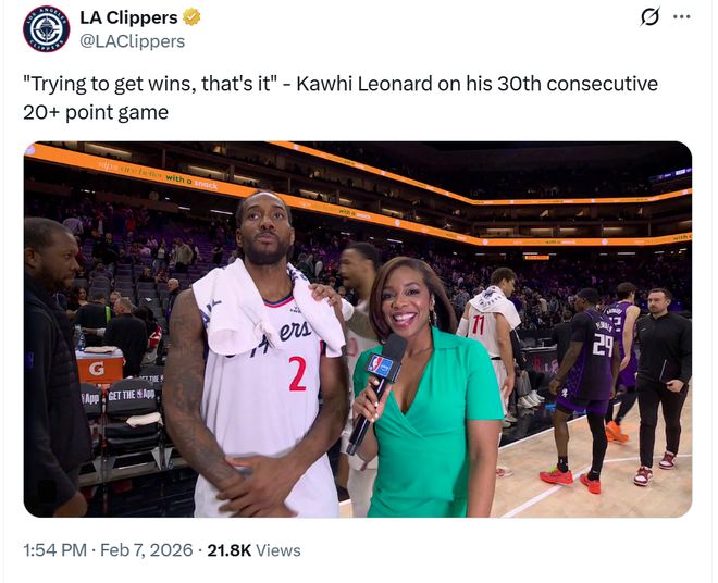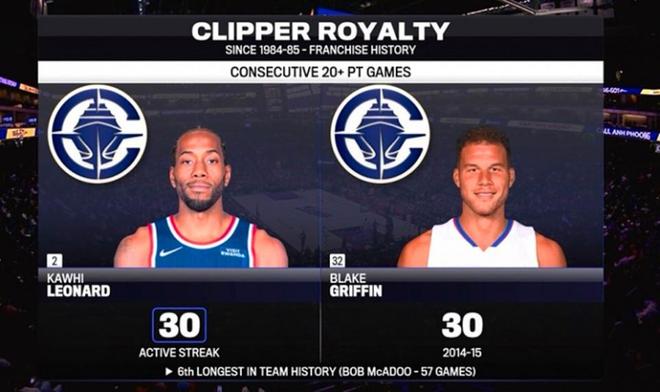 凭借这样的表现,小卡已经连续30场砍下20+得分表现继续刷新个人生涯最佳纪录,也追平格里芬并列快船队史第6,并且创84-85赛季后队史最长。