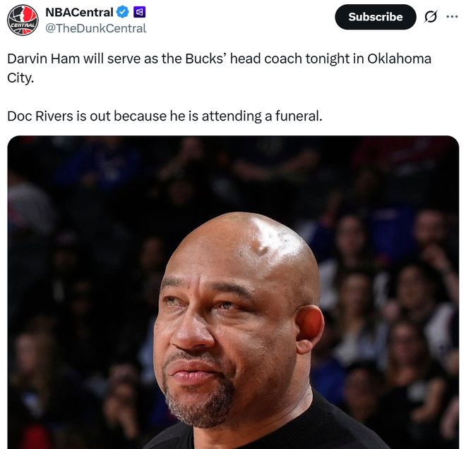 赛前采访时,雄鹿助教哈姆公开表示球队主帅道格-里弗斯因参加葬礼而缺席本场比赛,自己将在本场担任雄鹿临时主教练。