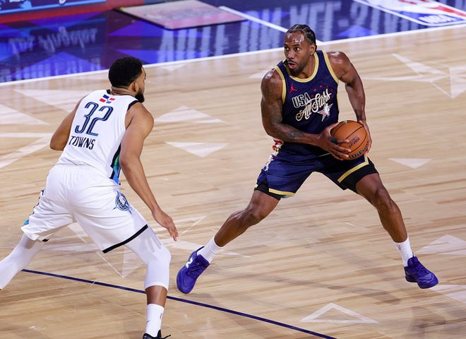 伦纳德打了3场比赛,总计24中13(三分12中7),5罚4中,得到37分9板3助4断,其中在对阵世界队的比赛中他打满12分钟,13中11(三分7中6),3罚3中,得到31分3板2助,效率惊人。