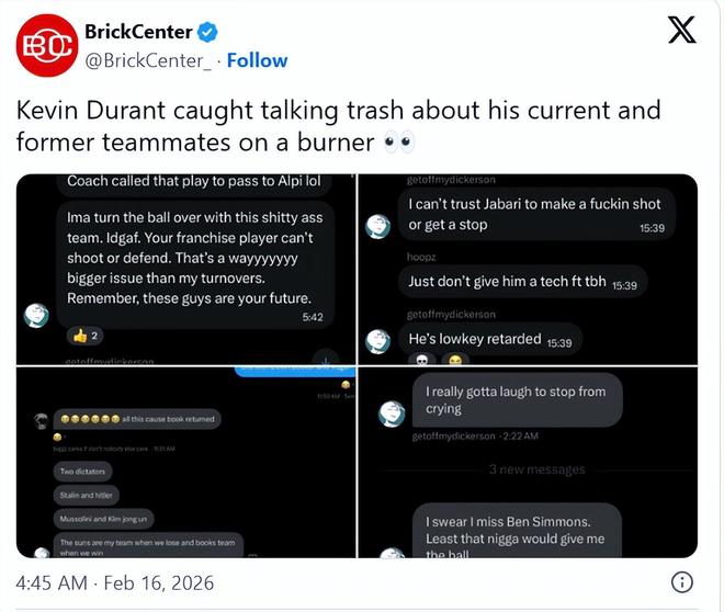 北京时间2月17日,杜兰特的疑似小号引起热议。在疑似杜兰特的小号上,有吐槽火箭和太阳时期队友的内容。名嘴比尔-西蒙斯直言无风不起浪。有虚假新闻账号趁机传播谣言,声称NBA会调查杜兰特的小号事件。
