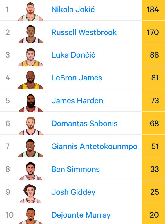 威少的第一,看起来还是很稳——领先约基奇23次。
