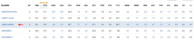 哈登加盟骑士队的6场比赛,场均32.1分钟,拿到18.7分8.7助攻5篮板1抢断0.8盖帽,命中率50.7%,三分命中率47.1%,罚球命中率86.7%,正负值+4.7。