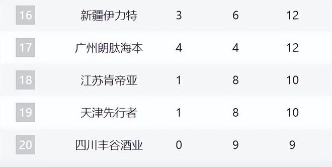 最后五名分别是新疆、广州、江苏、天津和四川。广州这轮拿下山西是惊喜,他们还少赛一场,也是4胜。新疆目前的麻烦还非常大,外援和主帅的实力都非常糟糕。江苏、天津和四川巩固最后三名,基本上没什么希望了。