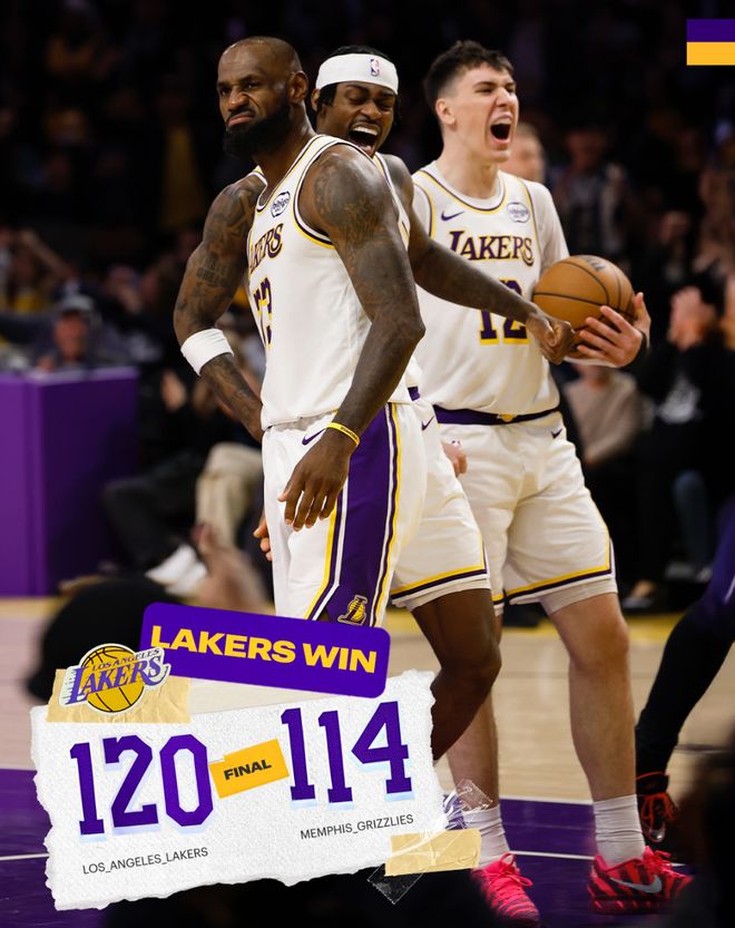 末节东契奇还在场下就看着詹姆斯一人带队追分,东契奇终于中投命中后助攻艾顿空接打停灰熊。东契奇眼神防守,东契奇继续眼神防守被韦尔斯一步过,东契奇命中了一个超远三分挽尊,东契奇接着第二个三分,东契奇助攻阿彪空接暴扣,随后灰熊犯规战术湖人拿下胜利。