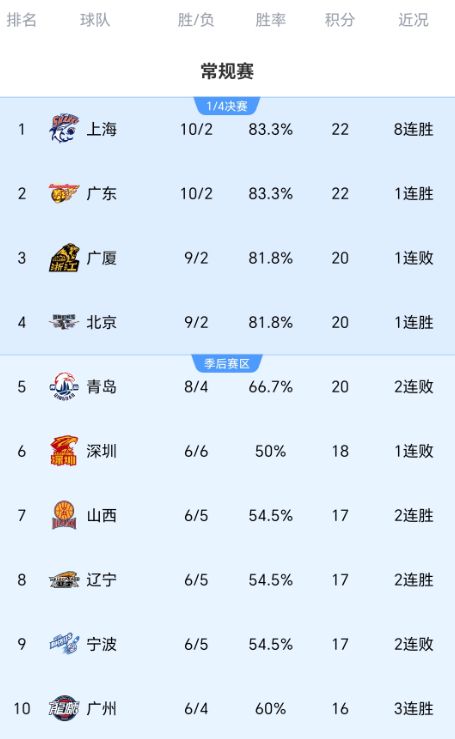 前十一轮过后,广厦队、上海队、北京队、广东队分列积分榜前四名,巧合的是,以上四队的战绩都是9胜2负。