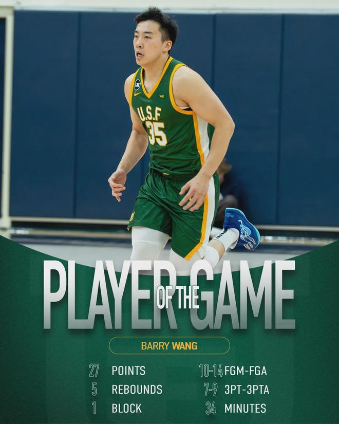全场比赛王俊杰首发出战33分钟,投篮14中10,其中三分球9中7,无比高效轰下27分5板1帽,单场得分创造个人NCAA生涯新高,带领旧金山大学80-60锤爆佩珀代因大学,攻防两端存在感拉满。