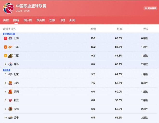 CBA排行榜更新:沪粤厦前3,广东冲榜首辽篮第10,四川12连败