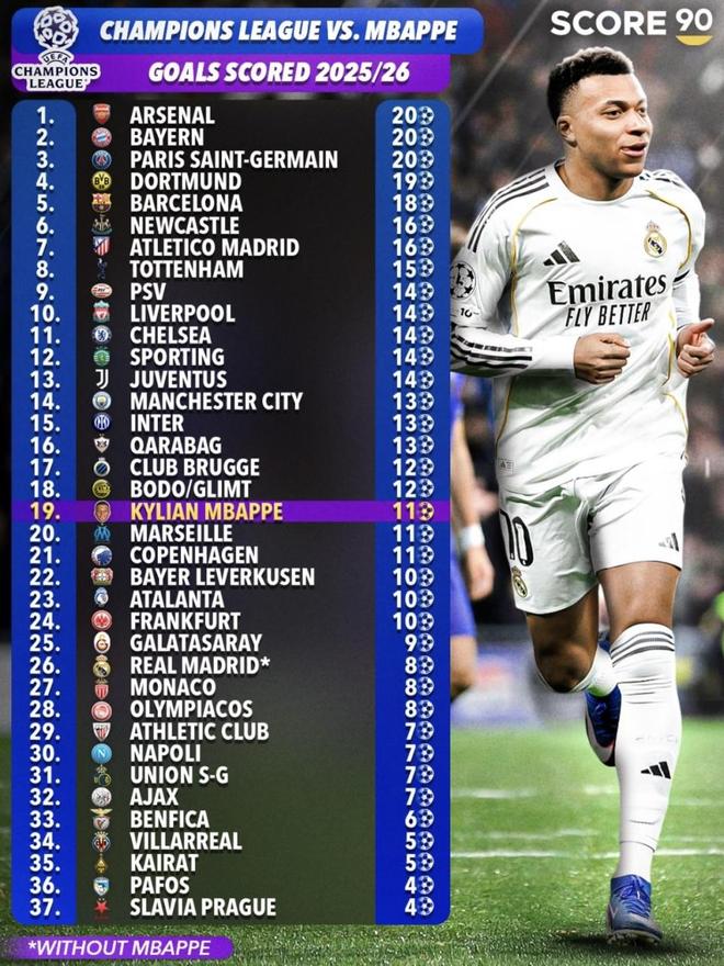 最近Score 90整理了2025/26赛季欧冠进球统计:阿森纳、拜仁、巴黎圣日耳曼并列20球领跑;多特蒙德19球、巴塞罗那18球紧追;另一组对照里,姆巴佩个人11球,而皇家马德里在“不含姆巴佩”的口径下只有8球。把这些数字放到同一张成绩单里,最扎心的不是谁排第几,而是进球到底集中在谁身上。(数据截至2026年1月23日)