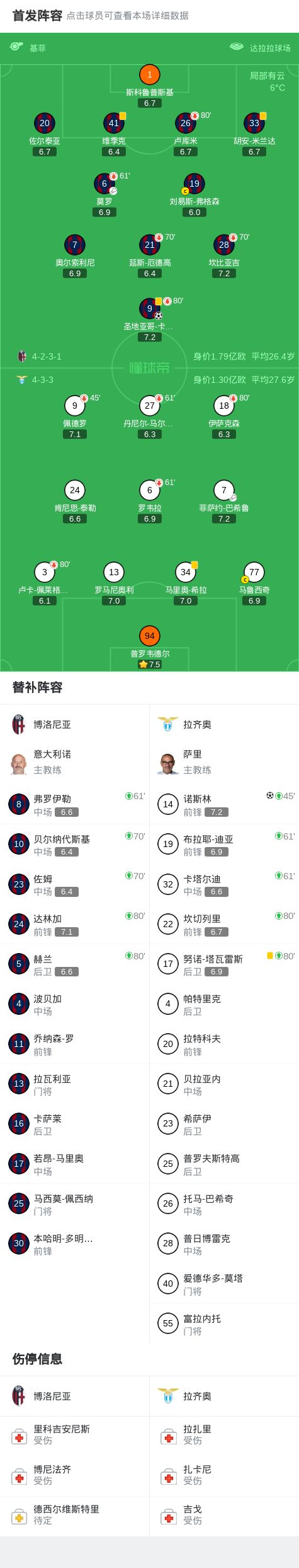 第33分钟,博洛尼亚左侧角球,卡斯特罗抢点破门,博洛尼亚1-0拉齐奥