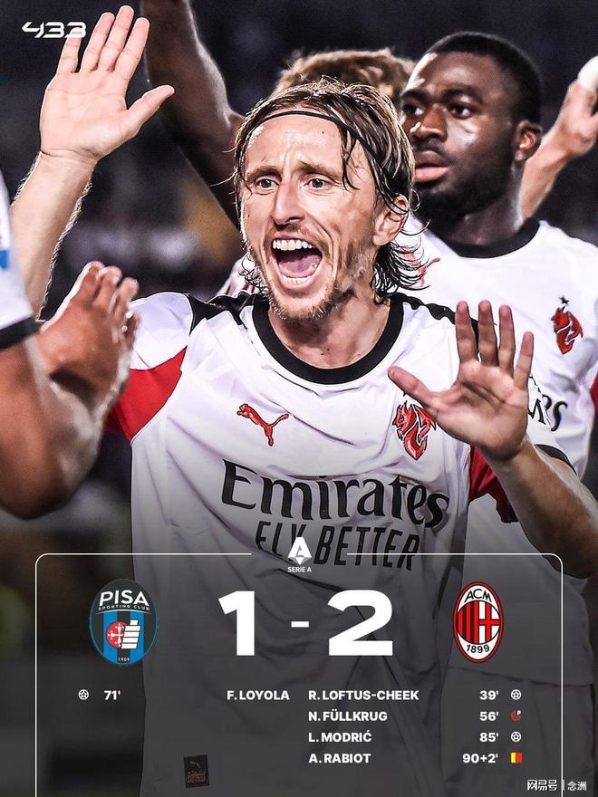 意甲第25轮,AC米兰2-1击败比萨,暂落后榜首5分。奇克破门首开纪录。拉比奥打进一球但是因菲尔克鲁格手球犯规在先被吹,菲尔克鲁格罚丢点球,洛约拉扳平,40岁的莫德里奇破门,拉比奥两黄一红被罚下。