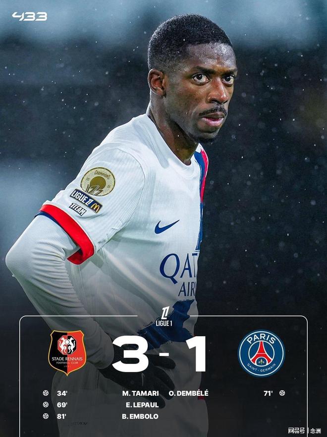 法甲第22轮,巴黎圣日耳曼客场1-3不敌雷恩,终结联赛7连胜。杜埃错失单刀良机,塔马里首开纪录,勒波尔扩大领先优势,登贝莱扳回一城,恩博洛锁定胜局。