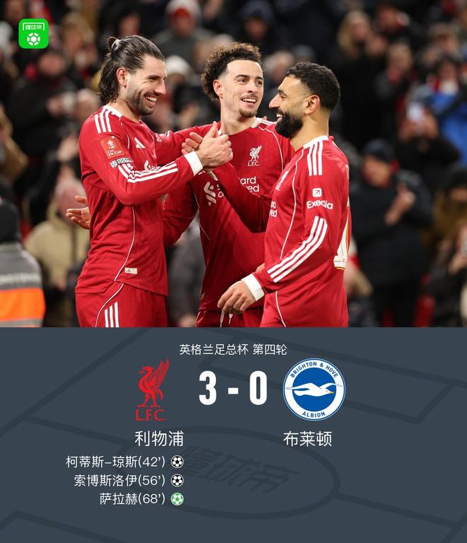 足总杯利物浦3-0布莱顿晋级,萨拉赫传射,索博、琼斯建功