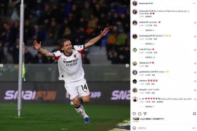 在本轮意甲,米兰2-1击败比萨。本场比赛40岁莫德里奇打进绝杀,赛后也当选全场最佳球员。莫德里奇在社媒晒出庆祝照片,配文写道:“小黄片下载安装会继续战斗下去,永不放弃!米兰加油!”