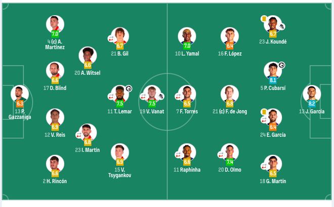 巴萨首发:13-霍安·加西亚、5-库巴西、18-赫拉德·马丁(63’3-巴尔德)、23-孔德、24-埃里克·加西亚(73’4-阿劳霍)、16-费尔明、21-德容、20-奥尔莫(83’22-贝尔纳尔)、7-费兰(73’9-莱万)、10-亚马尔、11-拉菲尼亚(63’19-巴德吉)。