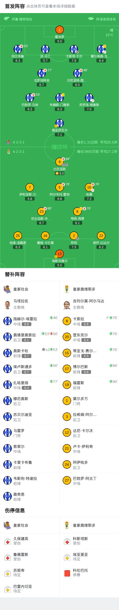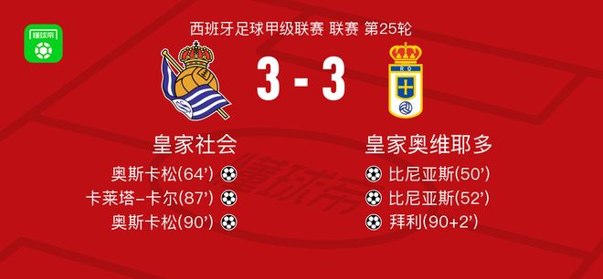 皇家社会3-3皇家奥维耶多,比尼亚斯先拔头筹,拜利扳平