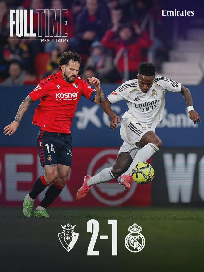 1-2!在一场充满了戏剧性、争议判罚和巨星崩盘的比赛中,皇家马德里客场惨遭奥萨苏纳绝杀。联赛8连胜戛然而止,先赛一场仅领先巴萨2分。这一夜,不仅是比分的失利,更是皇马本赛季最丑陋的一面被彻底揭开——VAR不再是护身符,姆巴佩迷失在对方的铁桶阵中,而阿韦洛亚的战术板上,似乎只写着“混乱”二字。