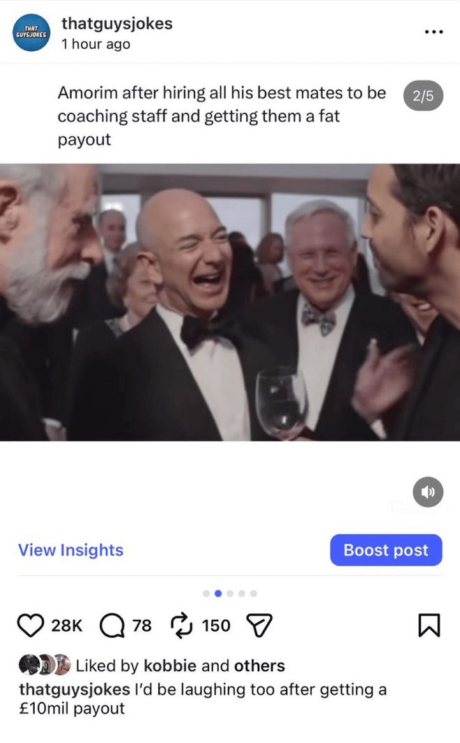 当然,曼联更衣室也有另类。例如20岁的英格兰本土新星梅努。在阿莫林被曼联解雇后,这位身价4000万欧元的红星,在社媒公开点赞嘲讽阿莫林的梗图:“阿莫林把最好的兄弟都拉进教练组、还让他们拿到一大笔赔偿金。”