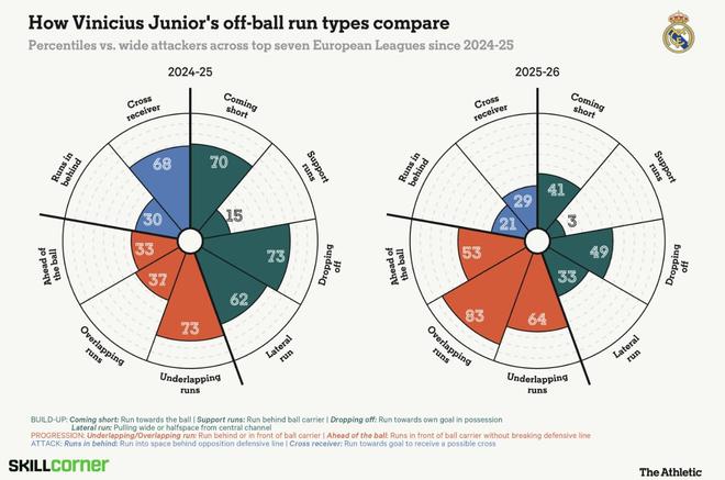 下方图表使用Skillcorner数据,对比了维尼修斯上赛季和本赛季无球跑动类型的变化,也从另一个角度说明了他角色的转变。他现在更多进行外线套边跑动,内切跑动减少,同时回撤接球、进行快速传跑配合的机会也在下降。