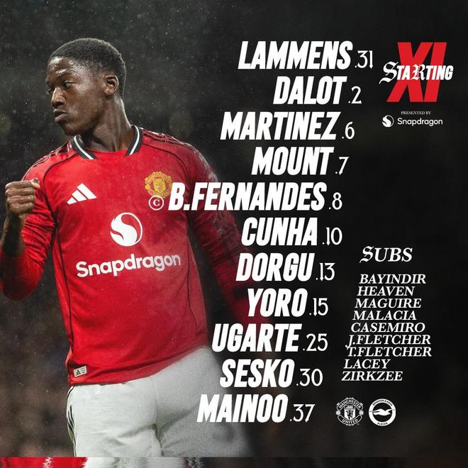 曼联首发:31-拉门斯、13-多古、15-约罗、6-马丁内斯、2-达洛特、37-梅努、25-乌加特、7-芒特、8-B费、30-谢什科、10-库尼亚
