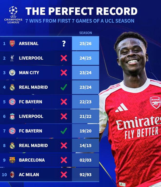 根据德转的统计,在阿森纳之前欧冠历史上曾有9支球队达成过开季至少7连胜的成就,但其中只有19-20赛季的拜仁以及23-24赛季的皇马拿到了最后的冠军,其余的7支球队包括92-93赛季的米兰、02-03赛季的巴萨、14-15赛季的皇马、21-22赛季的利物浦、22-23赛季的拜仁、23-24赛季的曼城以及24-25赛季的利物浦全部与冠军无缘。